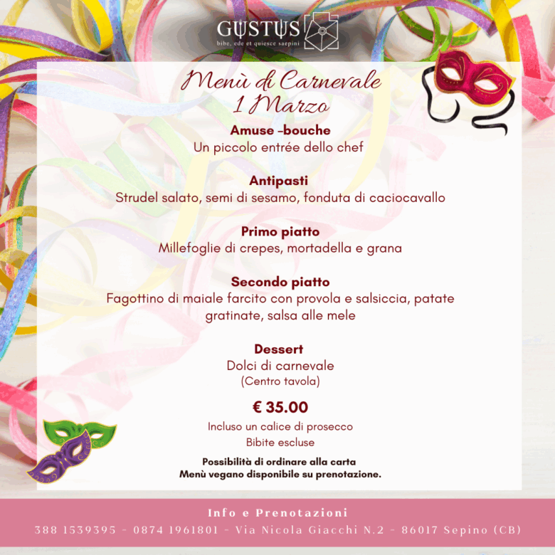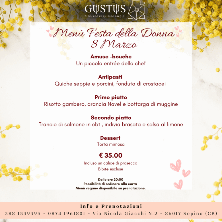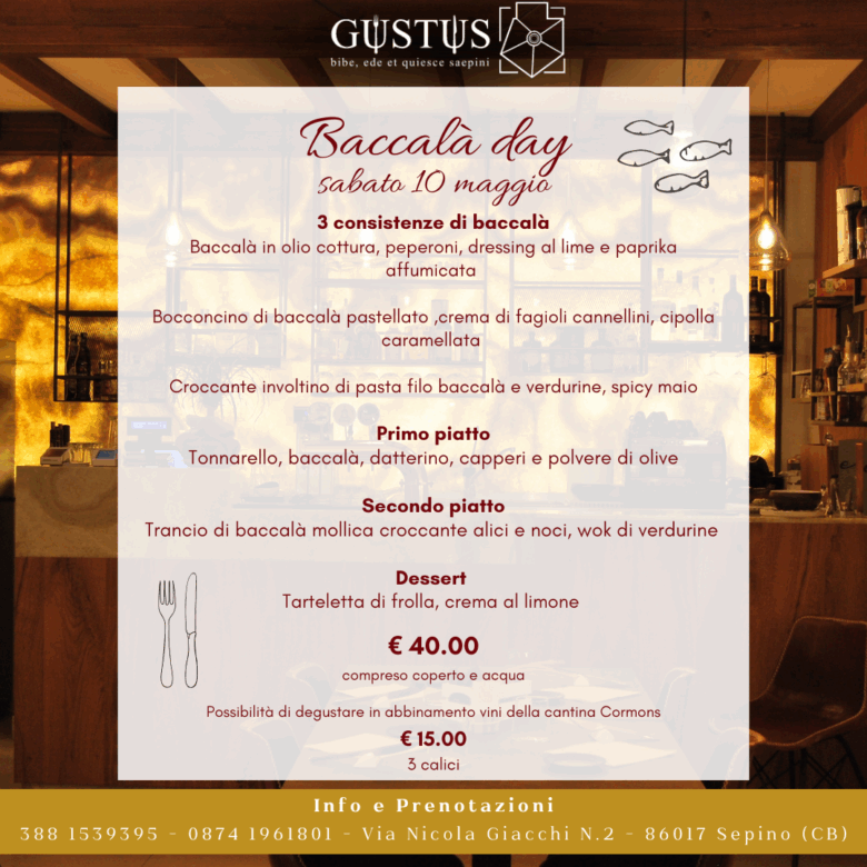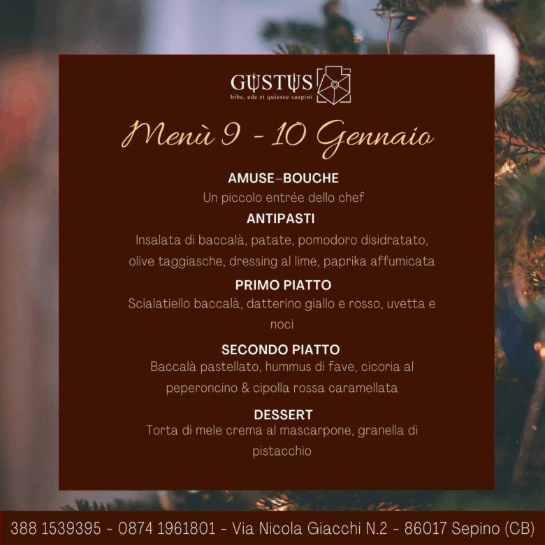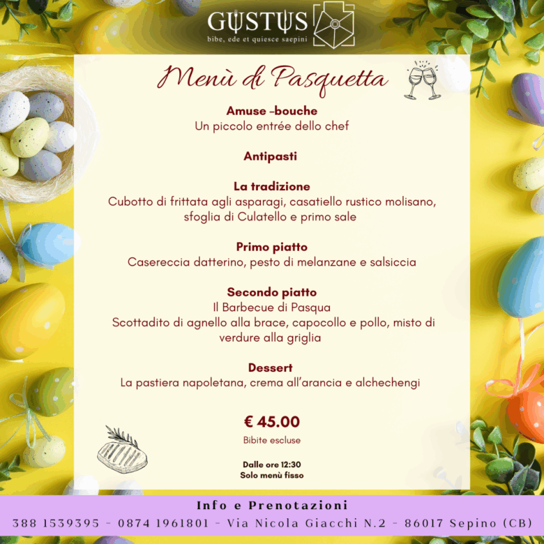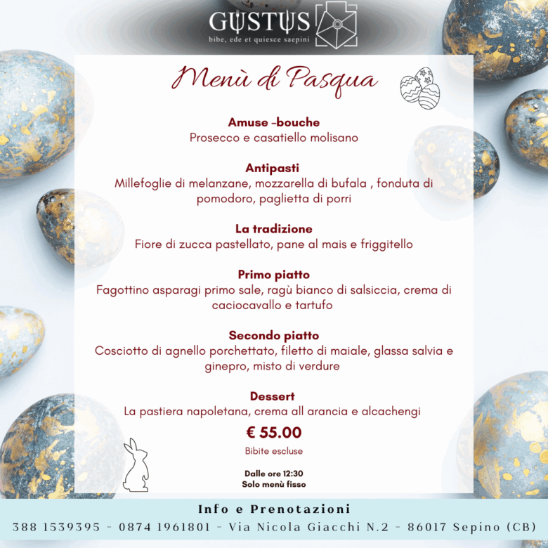 Nel cuore della piazza centrale di Sepino, splendido Borgo del Molise, trovate il Ristorante Gustus. Il Menu e il Personale vi accoglieranno con buon cibo e vino, esaltando le note di tradizione e inovazione del locale.